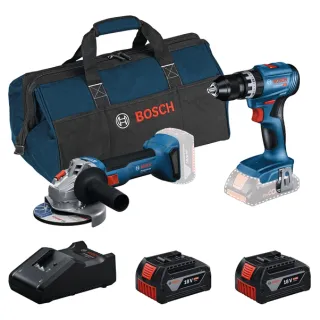 Kit Bosch Professional 18V composto da trapano battente GSB 18V-45 e smerigliatrice angolare GWS 18V da 125 mm. Il trapano brushless garantisce elevata affidabilità, coppia fino a 45 Nm e mandrino autoserrante da 13 mm, ideale per foratura e avvitatura su legno, metallo e muratura. La smerigliatrice offre ottime prestazioni per taglio e smerigliatura. Inclusi 2 batterie al litio da 4 Ah, caricabatterie e borsa. Prodotto nuovo, disponibili altri pezzi.