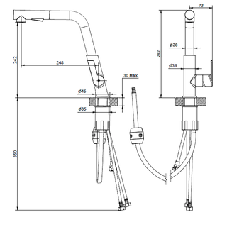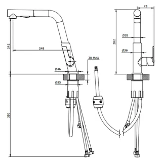 Miscelatore lavello Teorema Pisa nero con bocca alta squadrata e doccetta estraibile a 2 getti. Cartuccia Ø25 mm per un controllo preciso dell’acqua. Design moderno, resistente e funzionale. Prodotto nuovo, disponibili più pezzi.
