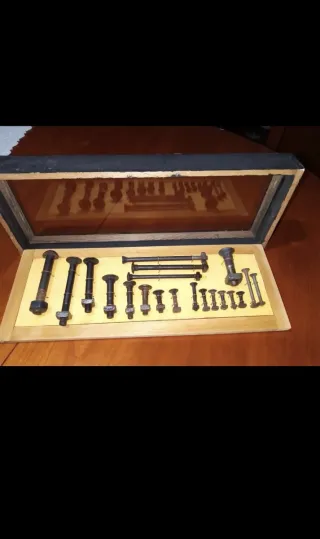 Teca in legno contenente bulloni da carro antichi