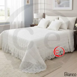 Elegante copriletto bianco con un design raffinato e dettagli curati. - Tessuto trapuntato con motivo a nido d'ape. - Ampio volant decorativo sul bordo inferiore. - Finitura in pizzo. - Colore bianco versatile.