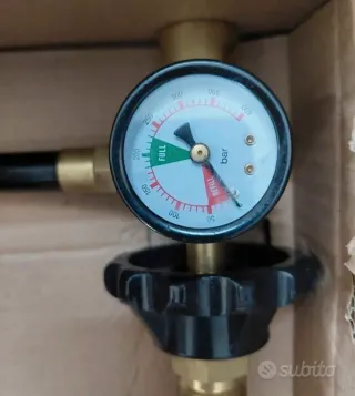 Riduttore di pressione nuovo, ancora nella sua scatola originale. - Manometro con indicatore di pressione in bar. - Zona verde FULL e zona rossa REFILL sul quadrante. - Valvola di regolazione nera.