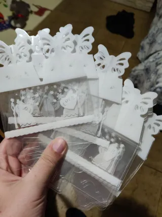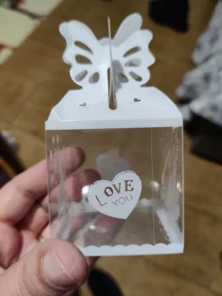 Scatoline trasparenti portaconfetti per sposi. Sono di plastica trasparente morbida. 5 cm per lato, più farfalla sopra per chiusura. 12 pezzi. Mai utilizzate.