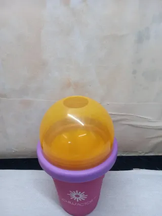 Bicchiere per granite e sorbetti marca ChillFactor. - Colore rosa, con bordo viola e coperchio giallo. - Design a forma di cono gelato.
