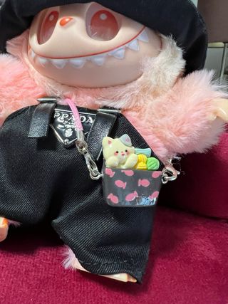 Un adorabile Labubu pronto per un'uscita alla moda. - Indossa un cappello nero con logo Pprada . - Pantaloni neri con bretelle. - Borsa a tracolla a forma di secchiello con decorazioni. - Dettagli in pelliccia rosa.