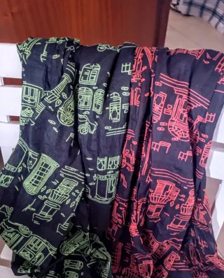 Sciarpe con un motivo di edifici e veicoli stilizzati. - Fantasia in verde su sfondo blu scuro. - Fantasia in rosso su sfondo blu scuro.