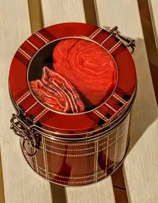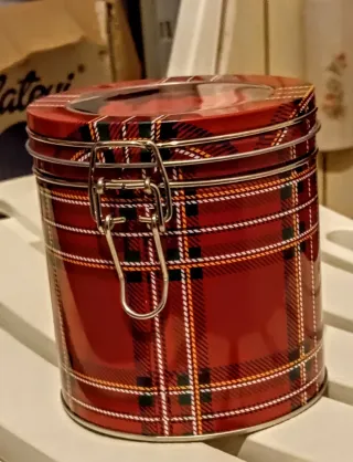Elegante barattolo in latta con fantasia tartan rossa e chiusura a gancio. - Coperchio trasparente per vedere il contenuto. - Finitura lucida. - Ideale per tè, caffè o biscotti.