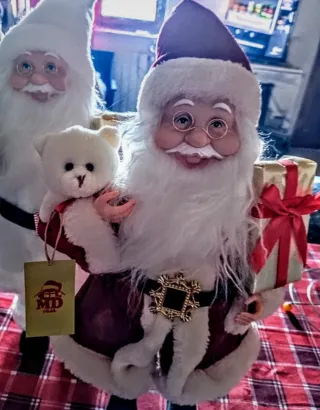 Tre simpatici Babbi Natale decorativi, perfetti per aggiungere un tocco festivo alla tua casa. - Babbo Natale con cappello verde e sci. - Babbo Natale con orsacchiotto e biglietto. - Babbo Natale con occhiali e pacco regalo.