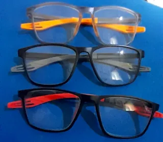 Set di tre paia di occhiali da lettura 3.5 + - Montatura grigia con aste arancioni - Montatura nera con aste grigie - Montatura nera con aste rosse