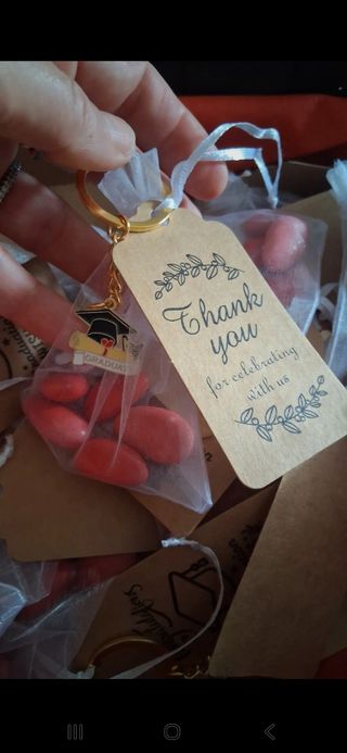 Bomboniere per laurea, complete di sacchetto in tulle e ciondolo a tema. - Sacchetto in tulle bianco. - Ciondolo con cappello da laureato e pergamena. - Confetti rossi all'interno.ho una quantità di 30