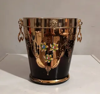 Splendido secchiello per il ghiaccio in vetro pregiato di Murano color Rubino. L'oggetto e interamente decorato a mano,secondo l'antica tecnica Veneziana "Tre Fuochi" Stile Barocco/Veneziano risalente agli anni '60/'70 Ricche decorazioni in oro zecchino,fiori in smalto a rilievo dipinto a mano,montatura in metallo dorato,con manici finemente lavorati Ideale per arricchire tavole eleganti e di classe,o come pezzo da collezione per amanti del vetro artistico Veneziano. Qualche lievissimo segno del tempo che ne arricchisce il fascino d'epoca e l'originalità Eccellenti condizioni di conservazione Integro H cm 23 Larghezza cm 18