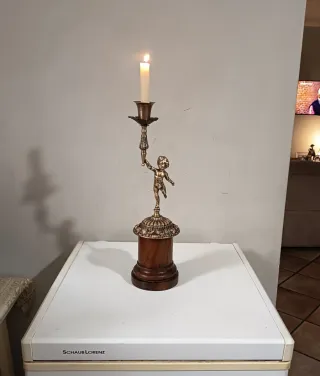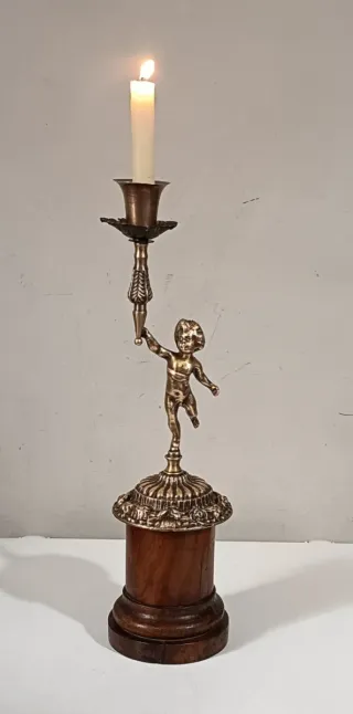 Splendido e imponente candeliere artistico di ben 46 cm d'altezza.Realizzata in ottone,dettaglio in bronzo,e con base in legno massiccio pieno noce Nazionale. Un classico dell'arte Neoclassica/Impero L'opera è risalente alla prima metà del XX secolo,raffigura un cherubino in movimento che sorregge il boccaglio. Pezzo centrale d'arredamento di grande presenza e forte impatto visivo,molto scenico. Eccellente stato di conservazione,patina originale che ne attesta l'autenticità e il fascino d'epoca. Misure Altezza cm 46 Larghezza cm 14 Base cm 12
