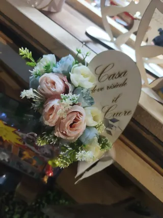 Cuore decorativo personalizzabile, ideale per appendere. - Realizzato in legno. - Decorato con fiori artificiali. - Scritta Casa dove risiede il cuore incisa.