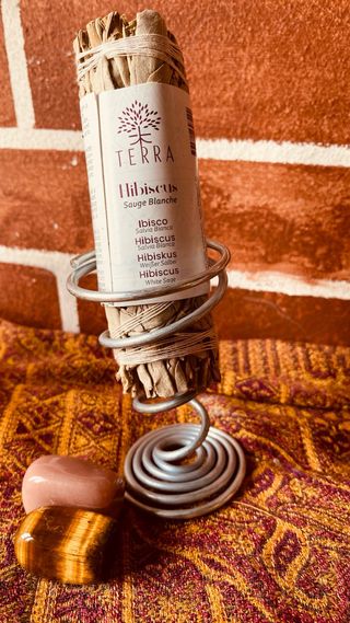 Set composto da un porta smudge in metallo e un mazzetto di salvia bianca profumata e ibisco . - Porta smudge in metallo con base a spirale. - Mazzetto di salvia bianca essiccata. - Profumazione all'ibisco.