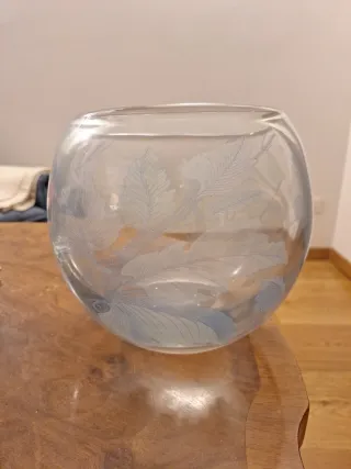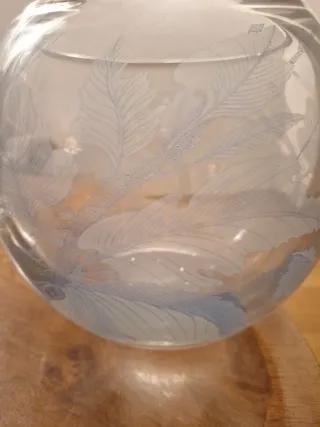Elegante vaso in vetro trasparente con decorazioni a forma di piuma. - Materiale: Vetro soffiato - Design: Decorazione a piuma stilizzata - Colore: Trasparente con dettagli azzurri/grigi