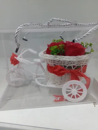 Delizioso triciclo decorativo in miniatura, perfetto per aggiungere un tocco di fascino. - Cesta intrecciata bianca. - Fiori rossi artificiali. - Dettaglio best wish for you sul telaio.