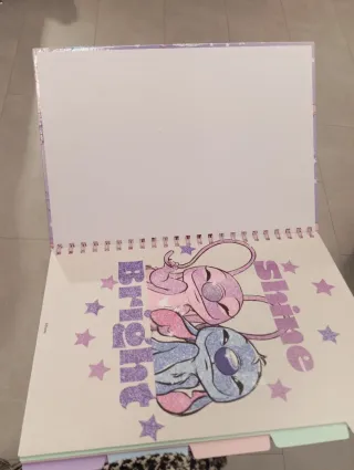 Taccuino con Stitch e Angel, decorato con glitter e un cuore. - Copertina con disegno di Stitch e Angel. - Dettagli glitterati. - Motivo a stelle e cuori.