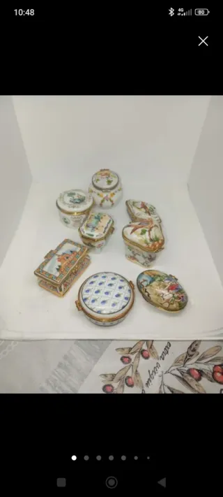 Set di quattro contenitori decorati, ideali per profumi o pillole. - Tre contenitori esagonali con decorazioni floreali. - Un contenitore ovale con decorazione floreale.