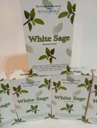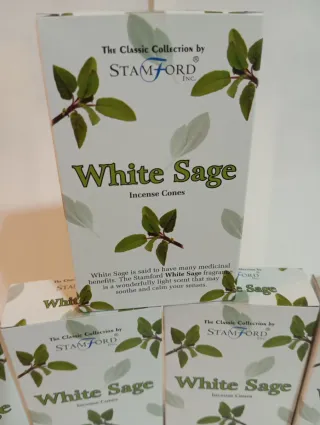 Confezione di coni profumati alla salvia bianca Stamford.15 coni - Fragranza: White Sage. - Marca: Stamford. - Tipo: Incenso in coni.