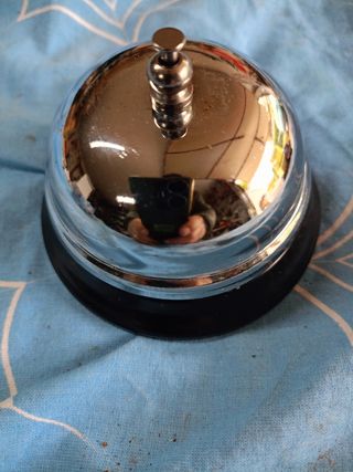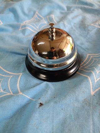 Campanella da banco in metallo lucido con base nera. - Materiale: metallo e plastica. - Colore: argento e nero.
