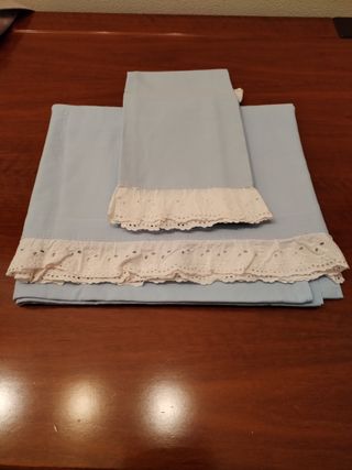 1 lenzuolo da una piazza + 1 federa in tessuto leggero di cotone azzurro con dettagli in pizzo bianco. - Federe con bordo in pizzo. - Lenzuolo con balza in pizzo.