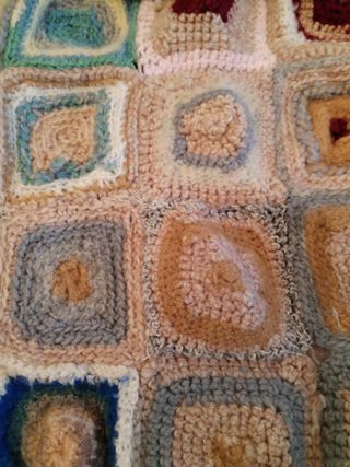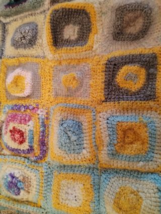 Coperta in filo di lana decorativa realizzata all'uncinetto con quadrati colorati. Misure : 145 x 100 cm. - Motivo a scacchiera con disegni interni. - Tonalità calde come giallo e beige. - Dettagli in grigio e azzurro. - Tocchi di colore con rosa, viola e rosso.