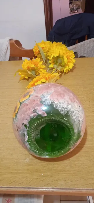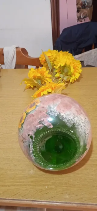 Vaso decorativo unico, dipinto a mano con motivi floreali. - Design floreale con girasoli. - Base in vetro verde. - Finitura materica e colorata.