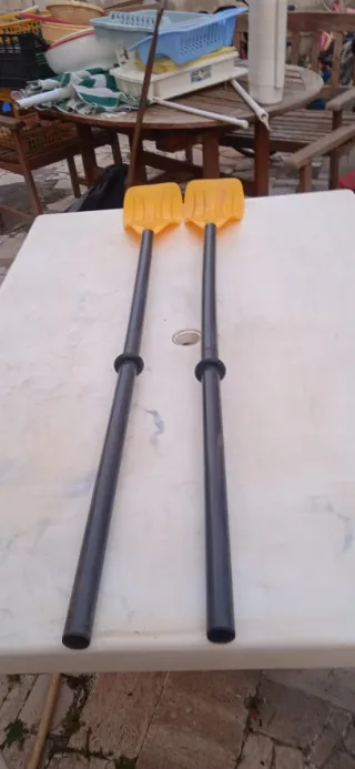 Coppia di pagaie in alluminio. - Pale in plastica bianca. - Manici in alluminio. - Anelli di bloccaggio in gomma.