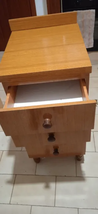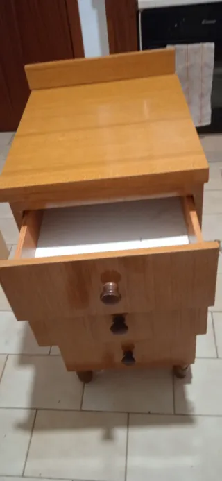 Pratica cassettiera in legno con tre cassetti. Ideale per organizzare i tuoi spazi. - Finitura in legno chiaro. - Maniglie a pomello in legno.