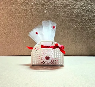 Graziosa borsetta bianca decorata con cuori rossi scintillanti e un fiocco. - Borsetta in materiale plastico bianco. - Decorata con cuori rossi. - Chiusura con fiocco rosso. - Include cioccolatini.