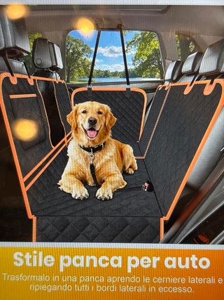 Proteggi il sedile della tua auto con questo telo. - Design trapuntato nero con bordi arancioni. - Si trasforma in una panca aprendo le cerniere laterali.