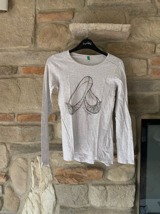 Maglietta a manica lunga per bambina del marchio Benetton. Presenta una stampa di scarpette da ballo. - Colore grigio melange. - Girocollo. - Maniche lunghe.