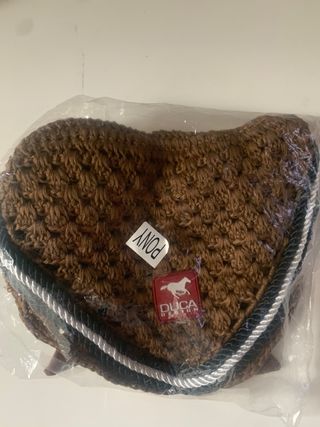 Cuffia da equitazione Duca Design per pony, nuova. - Colore marrone lavorato all'uncinetto. - Cordino decorativo bianco, nero e blu. - Etichetta PONY inclusa.