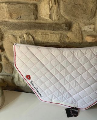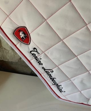 Sottosella da equitazione con logo Tonino Lamborghini. - Colore bianco. - Bordatura rossa. - Imbottitura trapuntata a rombi. - Logo Tonino Lamborghini applicato.