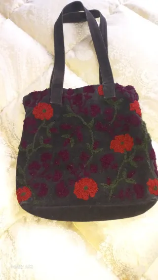 Borsa in pelle scamosciata con bellissimi ricami floreali. - Motivo floreale con fiori rossi e borgogna. - Dettagli ricamati su tutta la superficie. - Materiale scamosciato. - finemente foderata con tasche