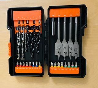 Set di punte per trapano per diversi utilizzi. - Punte piatte per legno (12, 16, 18, 20 mm). - Punte elicoidali per legno e muratura. - Inserti per avvitatore (PH1, PH2, PH3, PZ1, PZ2, PZ3, T10, T15, T20, T25, SL4, SL5). - Custodia inclusa.