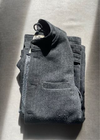 Cappotto da uomo Trez, usato pochissime volte. Un capo versatile e di qualità. - Tessuto grigio mélange. - Chiusura con bottoni. - Tasca a filetto sul petto. - Fodera interna con fantasia a spina di pesce.