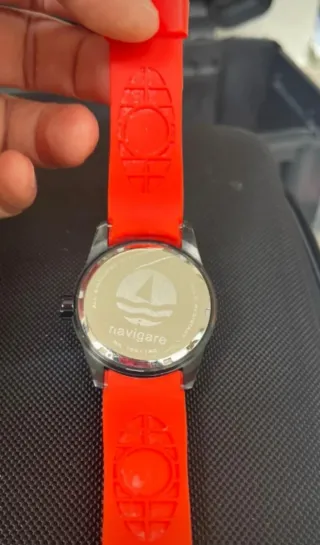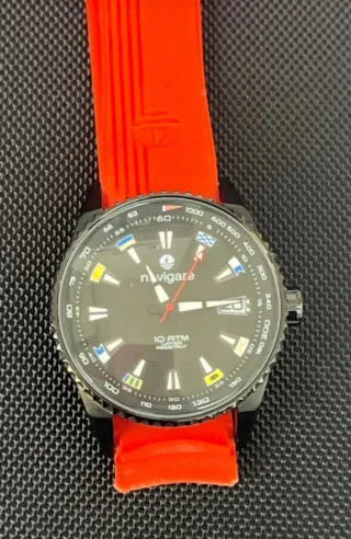 Orologio da polso Navigare con cinturino in gomma. - Cassa in acciaio brunito da 42mm - Resistente all'acqua 10 ATM. - Cinturino in gomma arancio. In condizioni estetiche e funzionali molto buone, trattasi di articolo usato che può presentare leggeri segni d'uso che non inficiano la sua tenuta ed estetica.