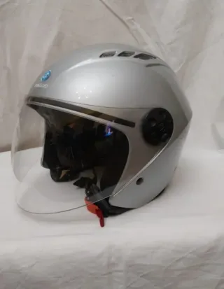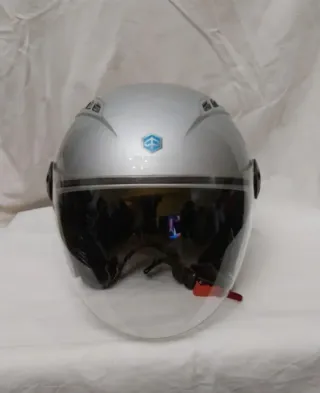 Casco jet Piaggio, taglia M. Colore argento, con visiera trasparente. - Logo Piaggio sul lato. - Prese d'aria sulla parte superiore. - Chiusura con cinturino. in condizioni estetiche e funzionali molto buone, riporta leggeri segni d'uso sulla calotta che non inficiano,però, la tenuta e l'estetica.
