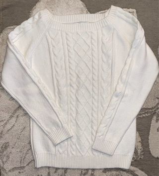 Maglione con trama a trecce, mai indossato. - Colore bianco avorio. - Morbido filato. - Scollo rotondo.