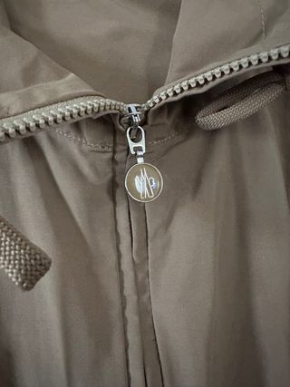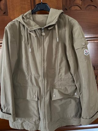Trench Moncler sfoderato di colore beige. - Cappuccio con coulisse. - Chiusura con zip. - Tasche frontali con patta. - Logo Moncler sulla manica.