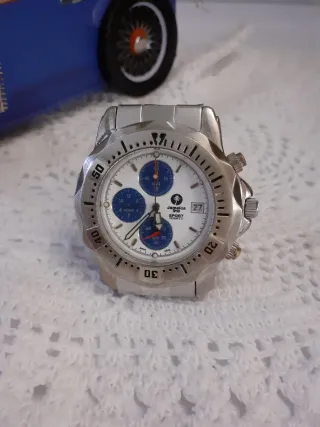 Philip Watch Imakos ref. R8273980515 CRONOGRAFO Materiale cassa acciaio Chiusura fondello 4 viti Dimensione cassa mm. 32 x 37 Cinturino acciaio Chiusura deployante a scomparsa Colore quadrante bianco Vetro minerale bombato Movimento quarzo svizzerro Impermeabile : Water resistant 5 ATM In condizioni estetiche e funzionali molto buone. Trattasi di articolo usato che riporta leggeri segni d'uso che non inficiano tenuta ed estetica. Le foto sono parte integrante della descrizione