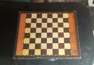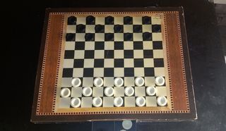 Vendo scacchiera/dama completa di pedine, in discrete condizioni, di produzione francese, come visibile dal marchio sulla stessa. La scacchiera era ricoperta da una sottile plastica, che purtroppo con il tempo si è rovinata e staccata! Tutti i segni di usura sono visibili in foto.