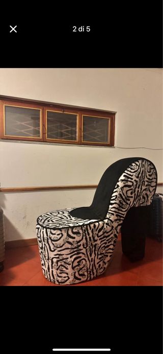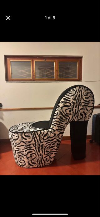 Originale sedia a forma di tacco alto, perfetta per dare un tocco di stile unico. - Rivestimento in tessuto con fantasia animalier. - Struttura robusta.
