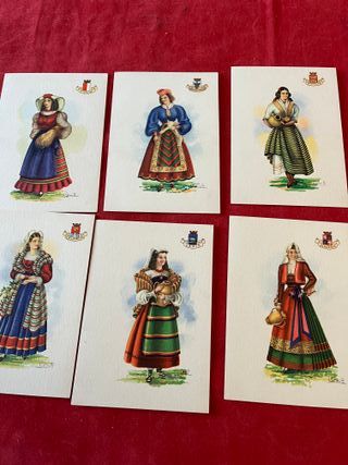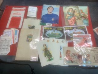 Il lotto è composto da: Album Figurine Ferrero (Alba) vuoto Collezione "Tessere Omaggio" Cinema Arezzo 6 cartoline illustrate con costumi tradizionali regionali italiani 3 stampe artistiche vintage Grande figurina/card del leggendario calciatore Giacinto Facchetti 2 etichette storiche di vino Brolio - Barone Ricasoli (Chianti) Inserto pubblicitario vintage "Chabert & Guillot" Nougat de Montélimar. Mostre d'Arte: Brochure e coupon della mostra "Il Mare di Dudovich" (Rimini, 1991) serie di Calendari tascabile 2 Biglietti Augurali Vintage con Goffratura Condizioni: Variabili data l'età dei pezzi.