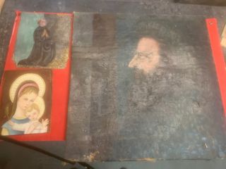 Il lotto comprende: Grande Ritratto di Eremita/Profeta: Olio su tela cm 45x45 montato su telaio in legno. Molto suggestivo, presenta delle scritte graffiate sulla superficie che lo rendono un pezzo davvero particolare e misterioso. Atmosfera intensa e vissuta. Madonna con Bambino (Firmata S. Cacciola): Olio su tela dai toni dolci e delicati. Firma dell'autore presente in basso a destra. Monaco in Preghiera: Piccolo dipinto su tela di sapore antico, raffigurante un frate in adorazione. Trattandosi di pezzi d'epoca, presentano segni del tempo che ne confermano l'autenticità.Il grande ritratto presenta un taglio come da foto