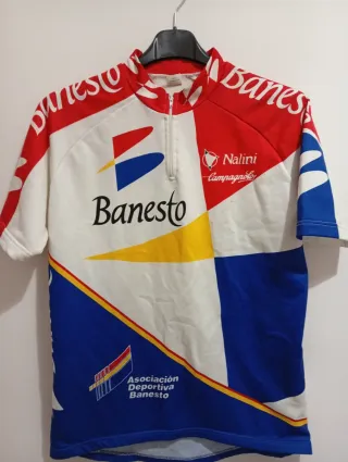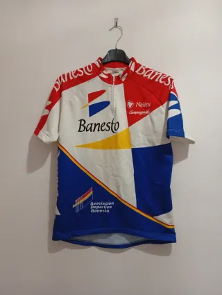 Maglia da ciclismo vintage Nalini, sponsorizzata Banesto. Un capo iconico per gli appassionati. - Design colorato con logo Banesto. - Sponsor Nalini e Campagnolo. - Dettaglio Asociación Deportiva Banesto sul fondo.