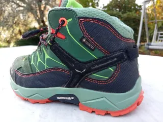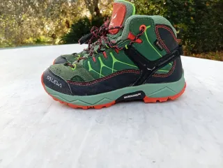 Scarponcini da trekking Salewa per bambini, numero 34. Modello JR ALP TRAINER MID IN GORE-TEX - Colore verde e arancione. - Tomaia in tessuto e scamosciato. - Membrana Gore-Tex. - Suola Michelin.