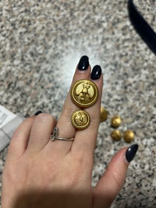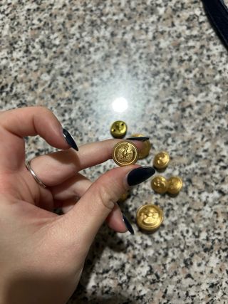 Set di bottoni vintage in color oro. - Design con aquila. - Due misure disponibili. sono di due grandezze differenti, così come presente in foto. Della grandezza maggiore sono presenti solo due bottoni. Della grandezza inferiore sono presenti sette bottoni. Ideale principalmente da decorazione, esempio per cappotti, blazer, giacche, giubbini. Mai utilizzati acquistati per errore in surplus. Perfette condizioni. Bottone vintage elegante design con Aquila.