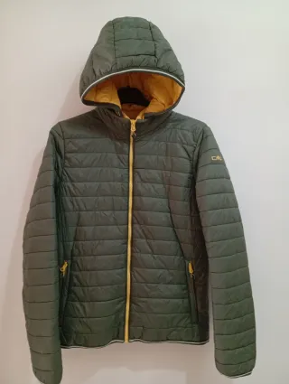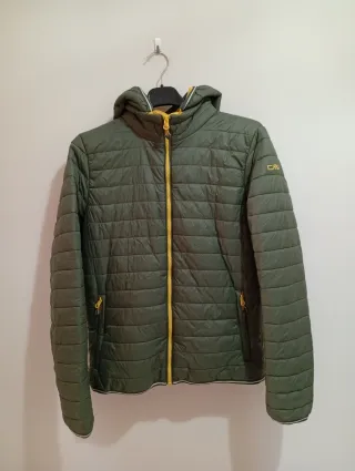 Piumino CMP per ragazzo/a di 14 anni, Adatto anche ad una taglia adulto S/M, nelle ultime foto trovate le misure. Colore verde militare con interno giallo. - Cappuccio asportabile tramite cerniera - Zip frontale gialla. - Tasche laterali con zip. - Logo CMP sulla manica.