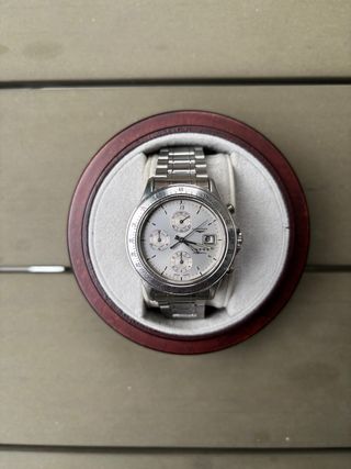 Longines Admiral cronografo watch acciaio ref. L3.601.4 , anni '90 cassa misura 40mm. Movimento cronografico meccanico a carica automatica con datario Cal. 2892-2. Cassa e bracciale in acciaio (chiusura deployante), vetro zaffiro. Completo di scatola in legno originale Longines ma senza certificati e garanzia. Ottime condizioni generali della cassa, del vetro, del bracciale, delle funzioni orologio e datario mentre la funzione chrono andrebbe verificata da un orologiaio perché la lancetta dei secondi non torna più sulle ore 12.00 al reset con il pulsante preposto.
